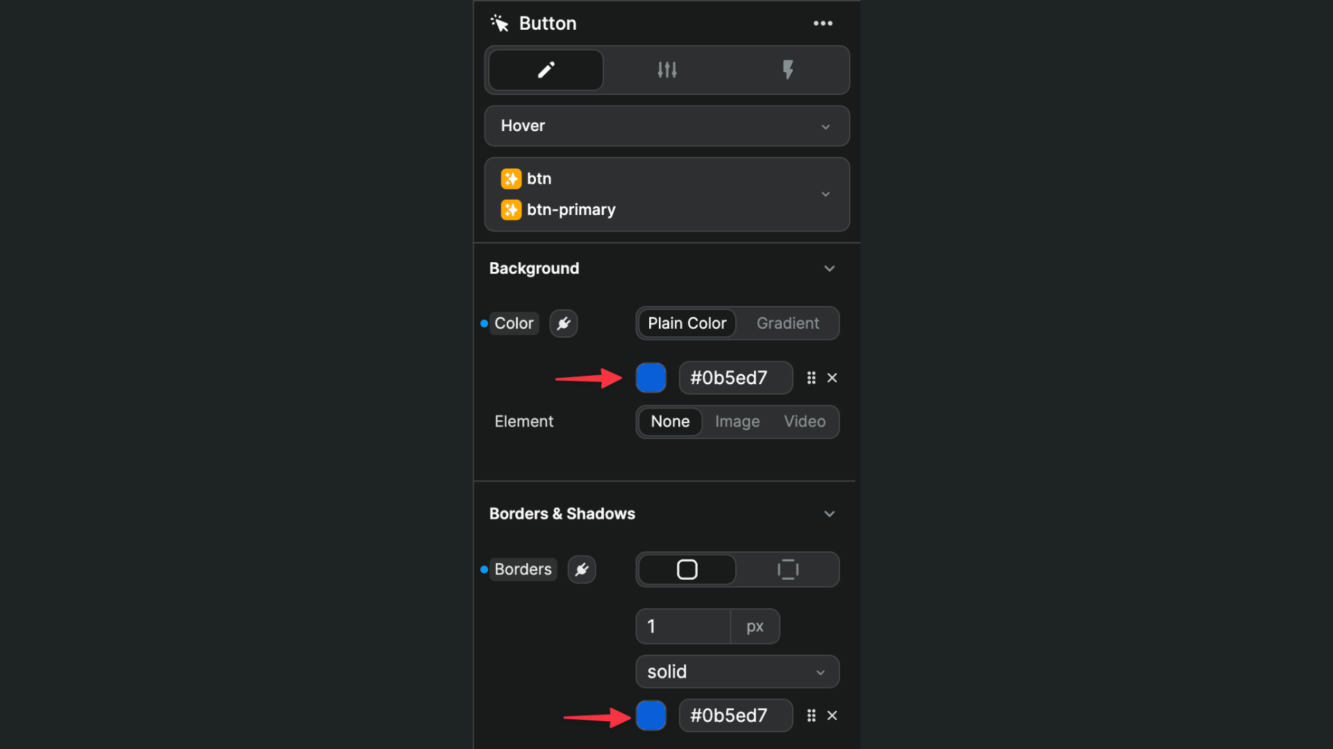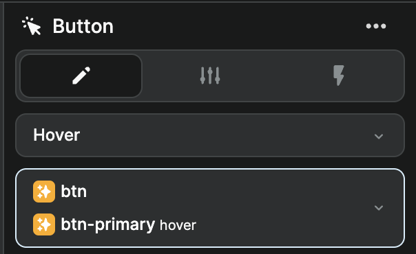 And make sure we are on that state when styling the element. In the example below, we are on an element with both the btn and btn-primary classes and we can see above the class names that the Hover state is selected: ​