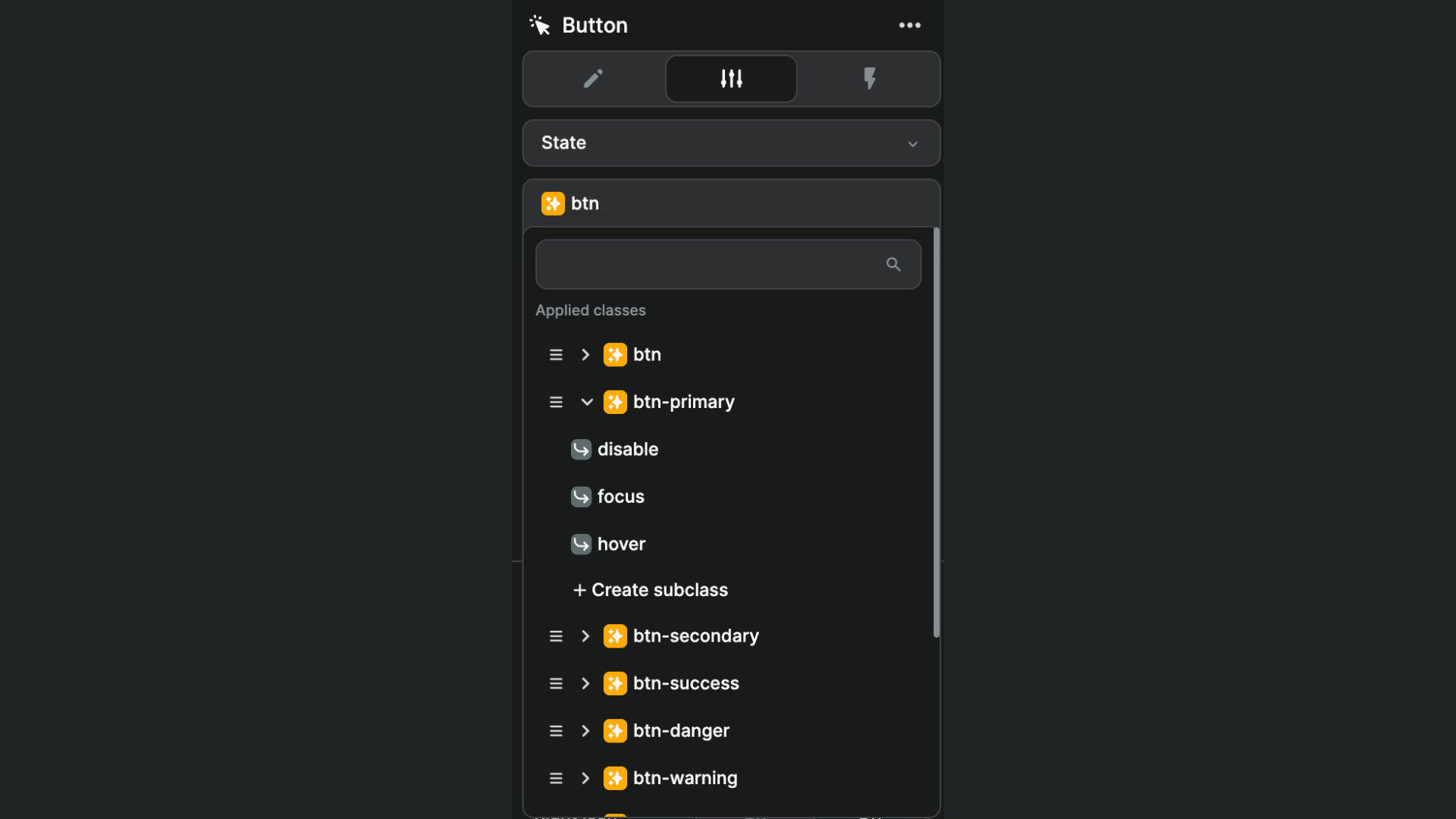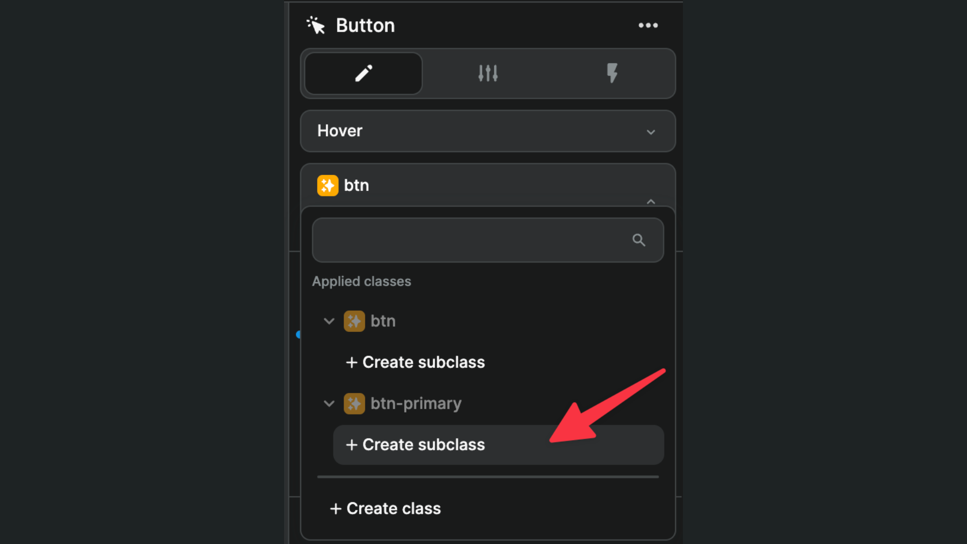 To add a subclass to a WeWeb class, simply click on Create subclass below the class you are working on.