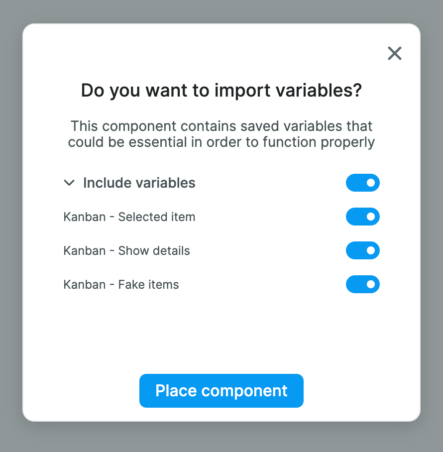 When you drag-and-drop the Kanban Element on the Canvas, you will be asked if you want to import Variables: