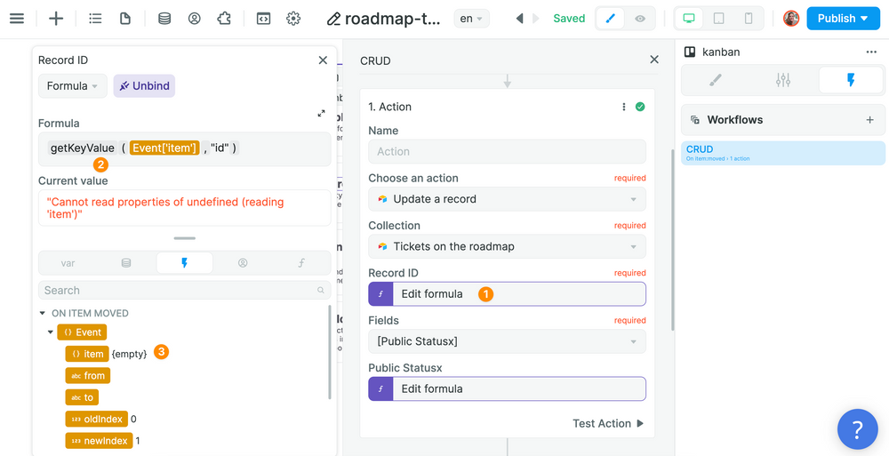 In the example below, we used a "getKeyValue" formula that gets the value of the key "id" of the item that was moved:
