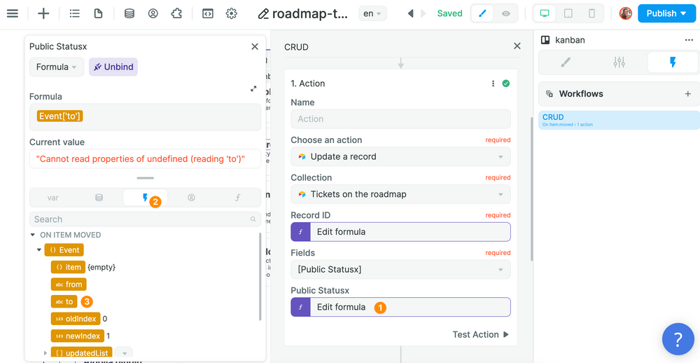 Note that for now the "Current value" is not displayed when we bind our record id and the public status info. In the future, we will improve the display so you can preview the data with the last item moved.