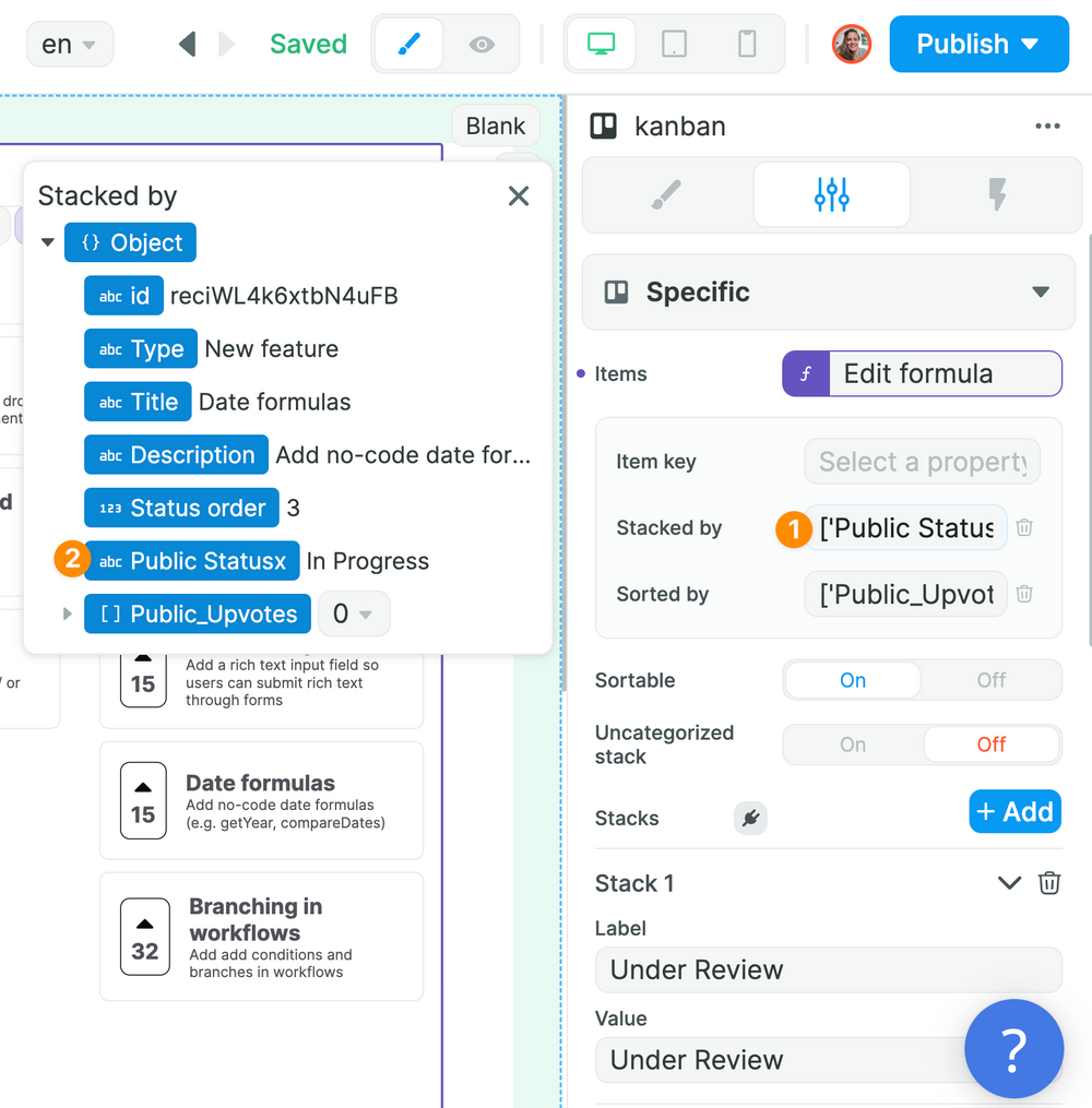 Then, we told Airtable that the new value for "Public Statusx" was the value of the stack where the card was moved:
