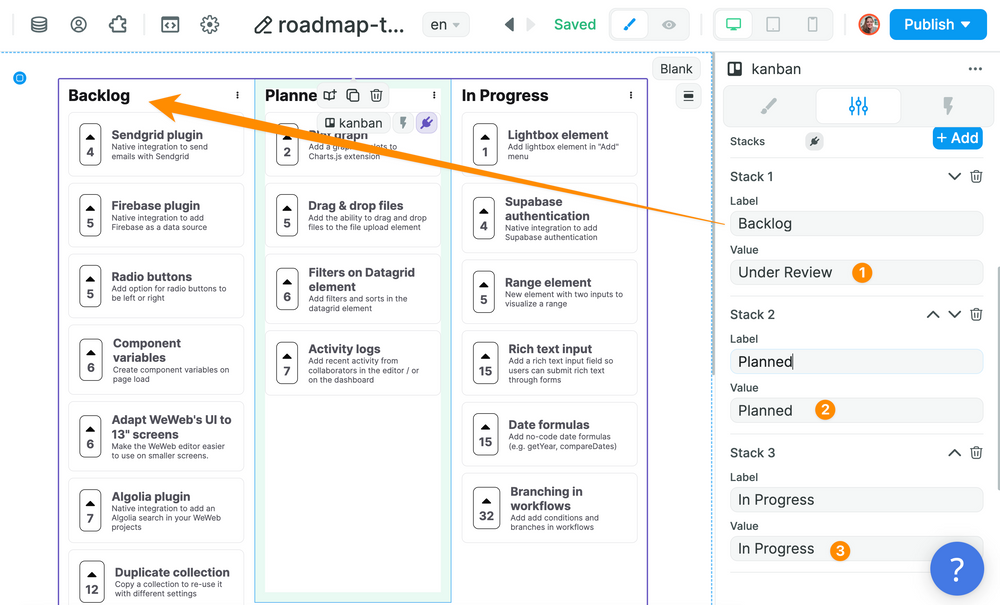 Step 2: Explain which field in the list of items corresponds to the columns in your Kanban