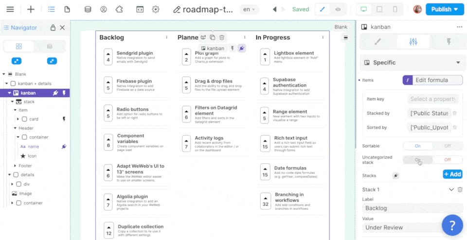 Once you have the Kanban on the page, you'll probably want to display and sort data in the Kanban.