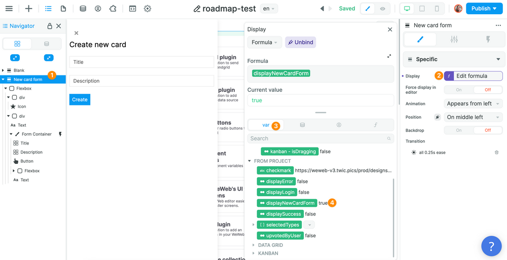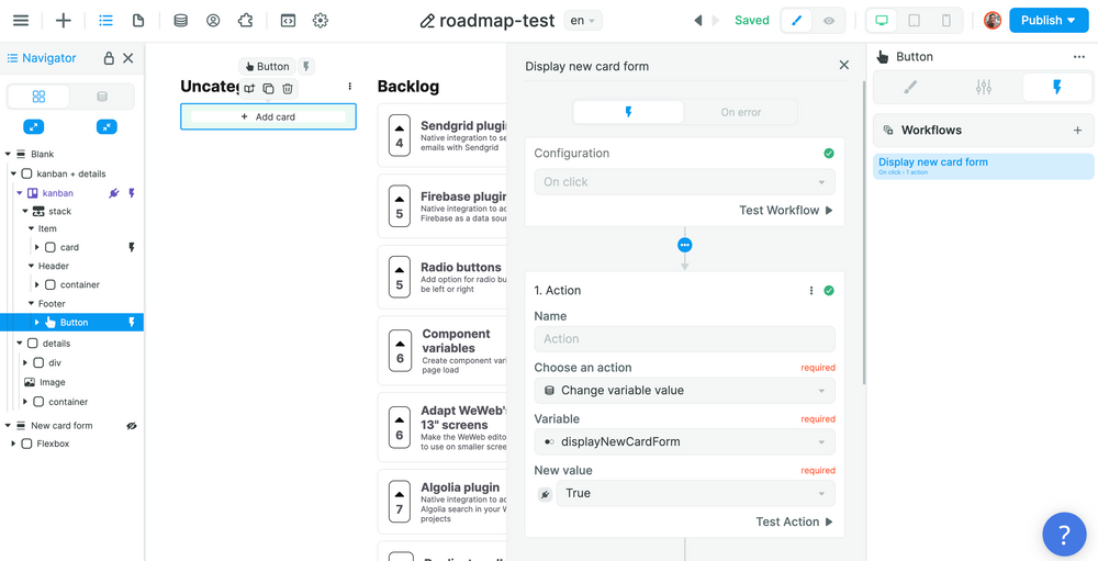 In the example below, when a user clicks on the "Add card" button, we change the value of a "displayNewCard" Variable to "true":