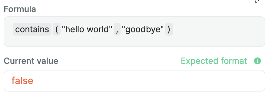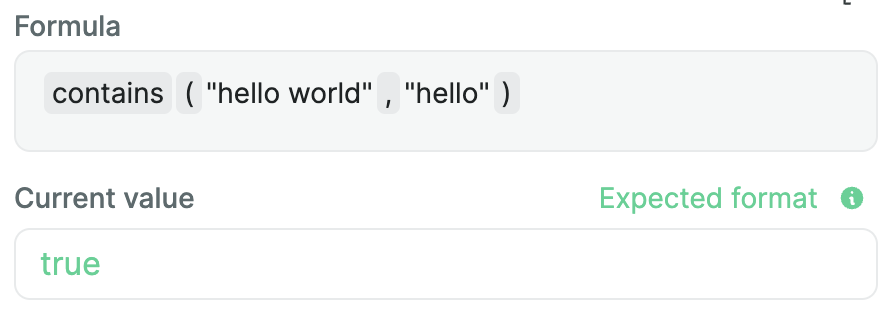 This formula will return a boolean (true or false) according to if a text is present inside another one.