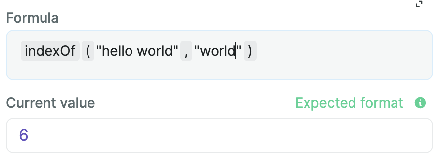 Let's take the text "hello world", if we were to search the position of the substring "world" inside it, indexOf will return 6 as "world" begins on the sixth index (remember, spaces and special characters do count in strings!).