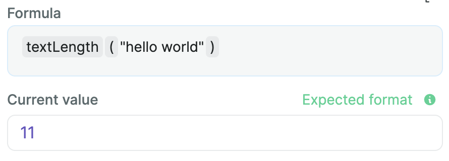 The textLength formula will return the length of a text, meaning its number of characters (spaces and special characters included).