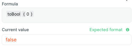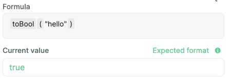 toBool ​Given a value, this formula will return a boolean value (true or false) based on the value truthiness of falsey-ness.