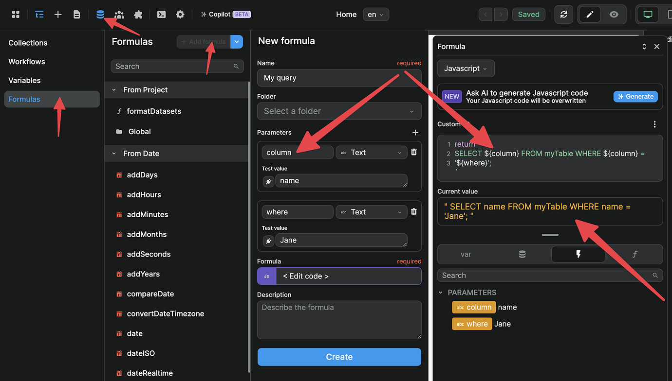 When adding your formula, remember to select the Javascript option to open the code editor and to click on Create to save the formula.