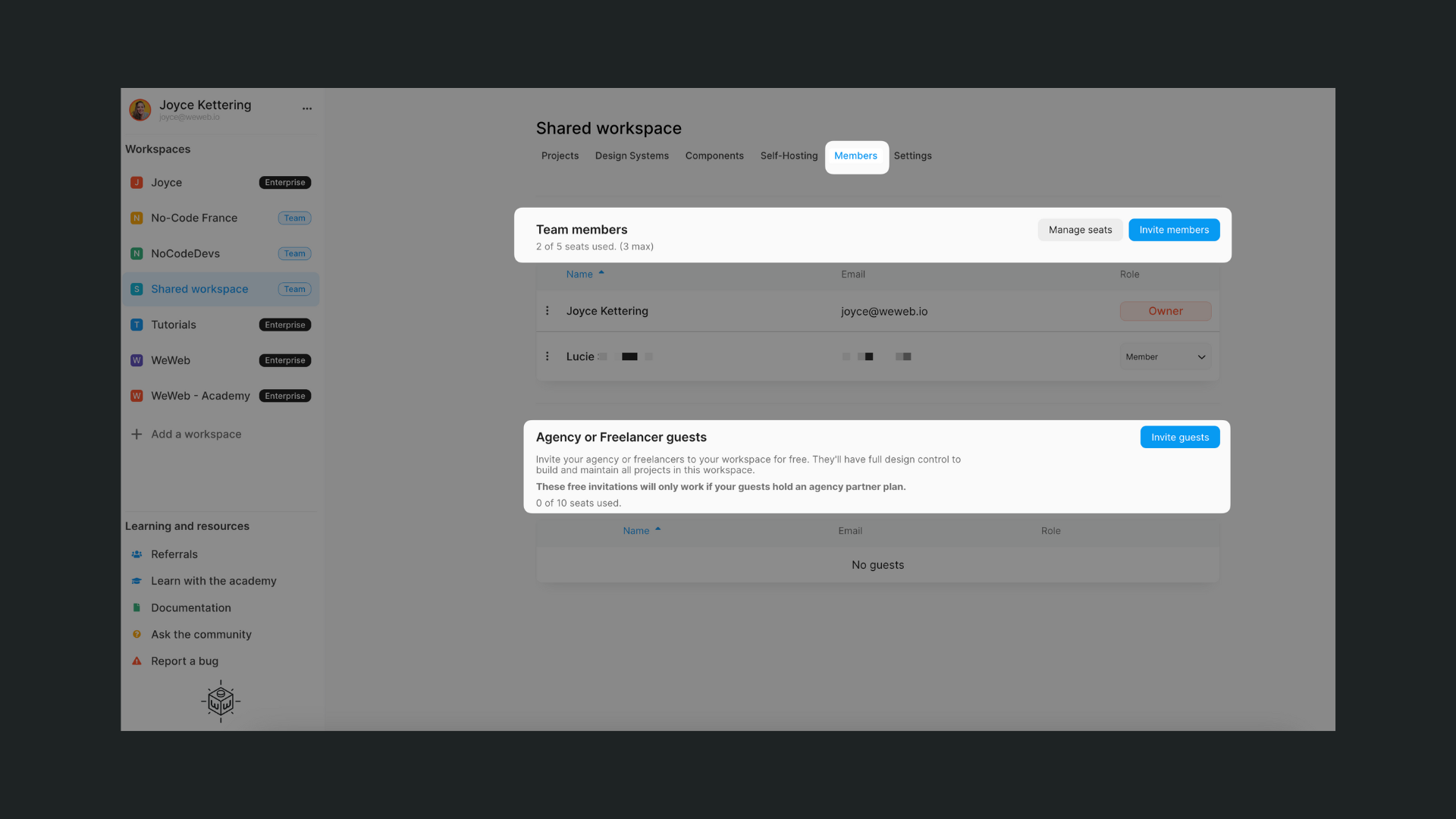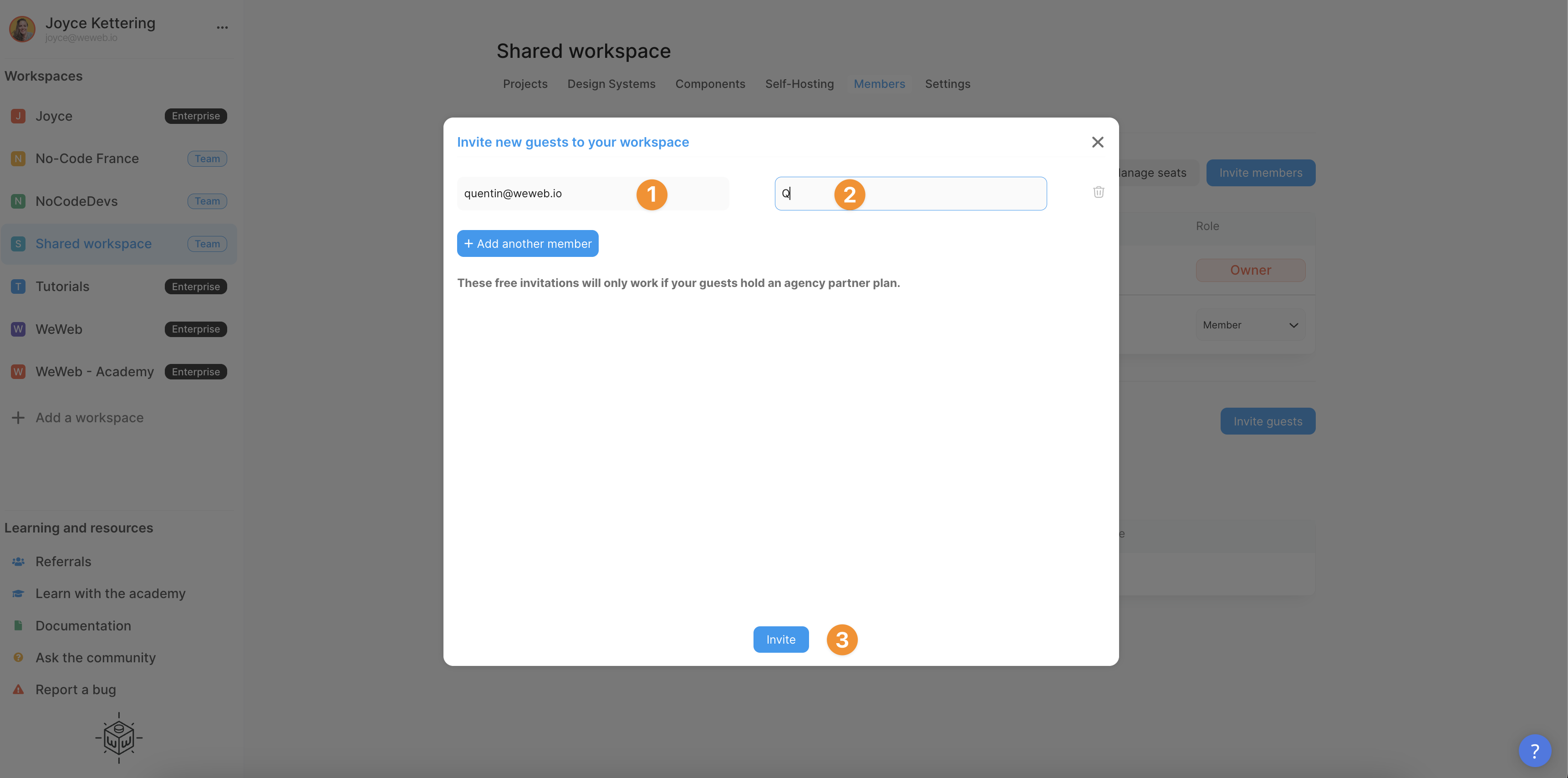 When inviting agency or freelancer guests, make sure to use the email address they used to subscribe to the WeWeb agency partner plan. The invitation will not go through otherwise.